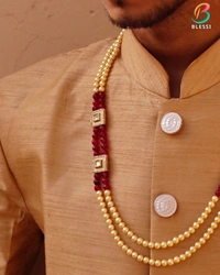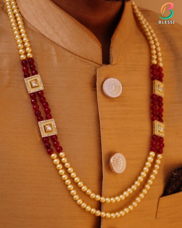 Elevate your wedding day ensemble with the timeless elegance of the Kundan And Pearl Two Line Groom Mala, exclusively from BLESSI. Designed for grooms who appreciate traditional sophistication and modern craftsmanship, this exquisite piece is a perfect blend of regal charm and intricate detailing. Whether you're looking to complete your wedding sherwani or create a striking traditional look, this groom mala will make you stand out with unmatched grace.