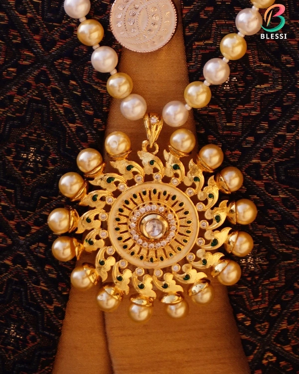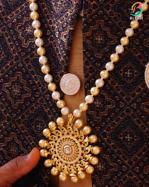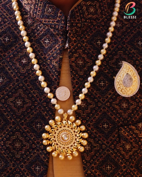 Elevate your wedding attire with the BLESSI Rich Look Pearl With Georgios Pendant Ivory Mala, specially designed for grooms who aim to exude elegance and timeless sophistication. This exquisite piece from BLESSI combines the charm of classic ivory pearls with the grandeur of a stunning Georgios pendant, making it the perfect accessory for your big day.